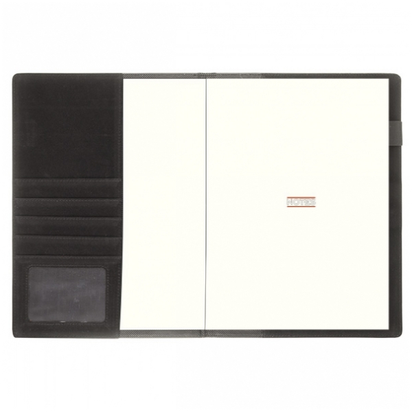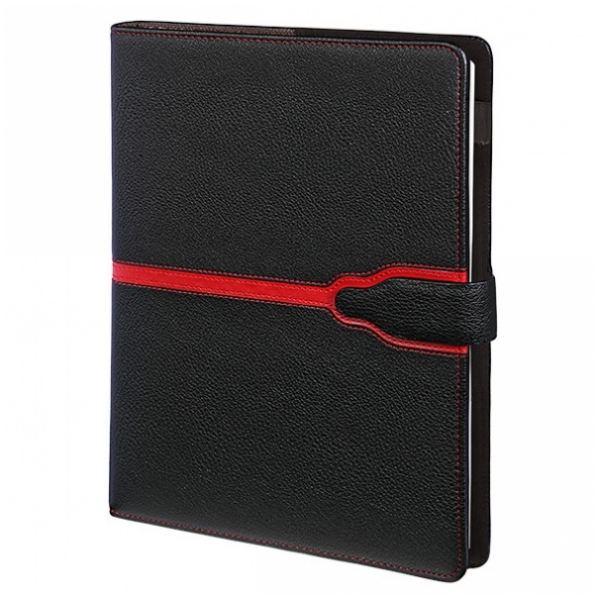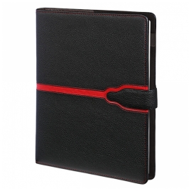 Łączona termo wrażliwa okładka o grubej strukturze z czerwoną wszywką przez środek oraz obszyciem wokół krawędzi. Wykończenie wewnątrz czarnym zamszem. Z zapięciem na magnes. Dobre do tłoczenia i laserowania.